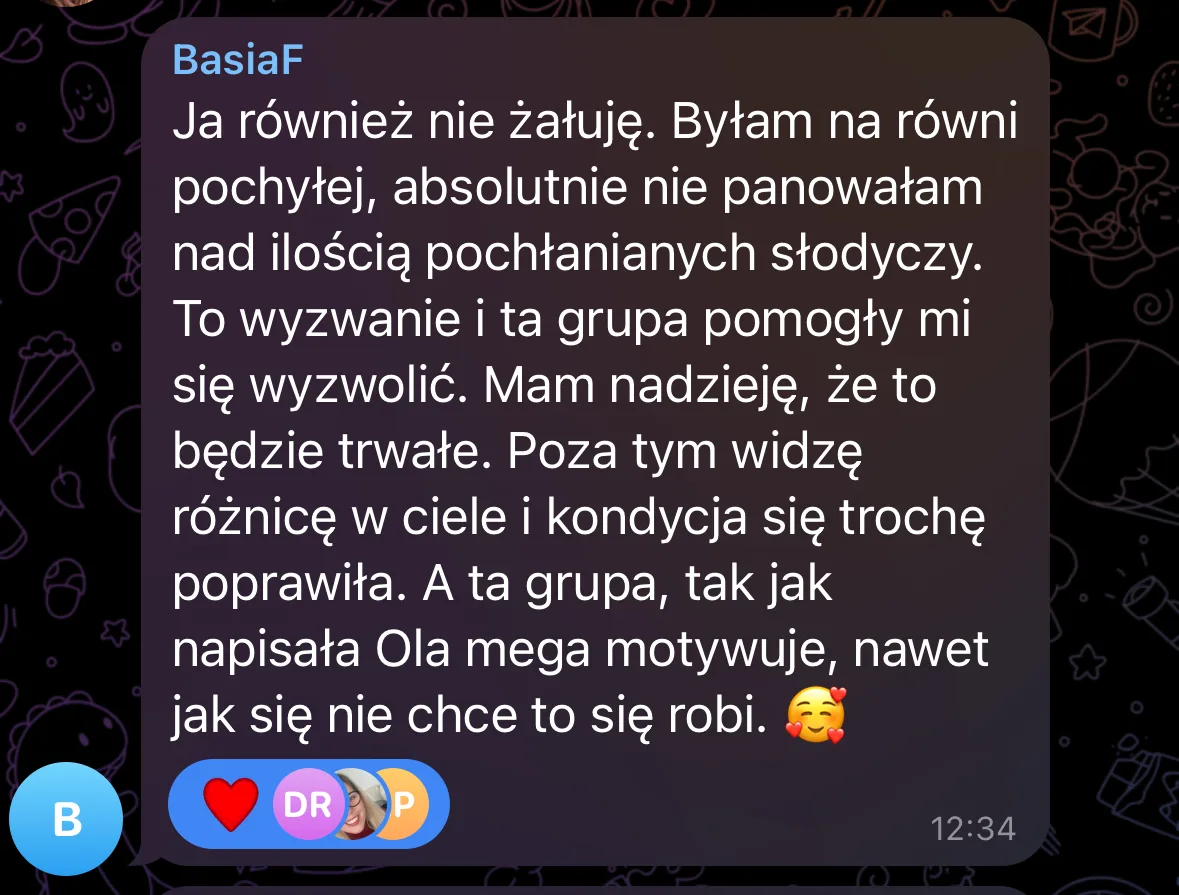 Ta grupa to miejsce naszych codziennych spotkań, miejsce gdzie codziennie się motywujemy, miejsce gdzie codziennie wrzucam instrukcję co danego dnia powinnaś zrobić aby osiągać jak najszybsze efekty.